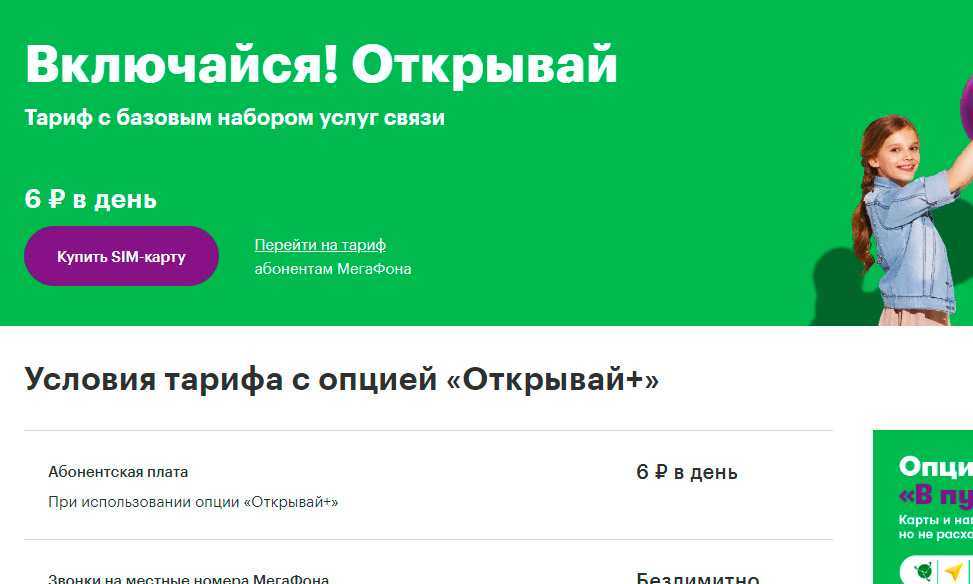 Базовый план линейки. За 6₽/день позволяет совершать звонки на местные номера, кроме MegaFon, за 2 рубля. Сто мегабайт интернета на «Открывай» обходятся в 25 руб.