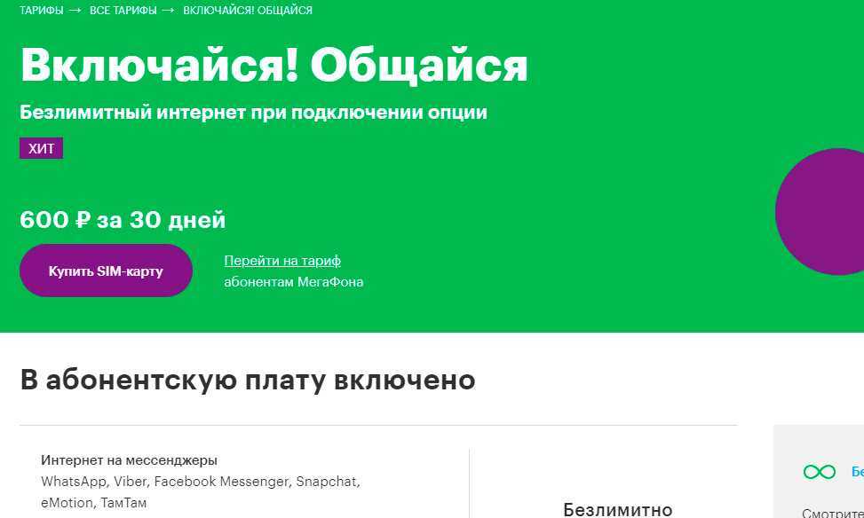 ТП для мобильного. За 3000 рублей на 30 дней абоненты получают безлимитные интернет, звонки и сообщения на MegaFon. Выделяются пакеты на 5000 минут для общения с клиентами других компаний и 100 SMS в день для отправки на номера РФ.