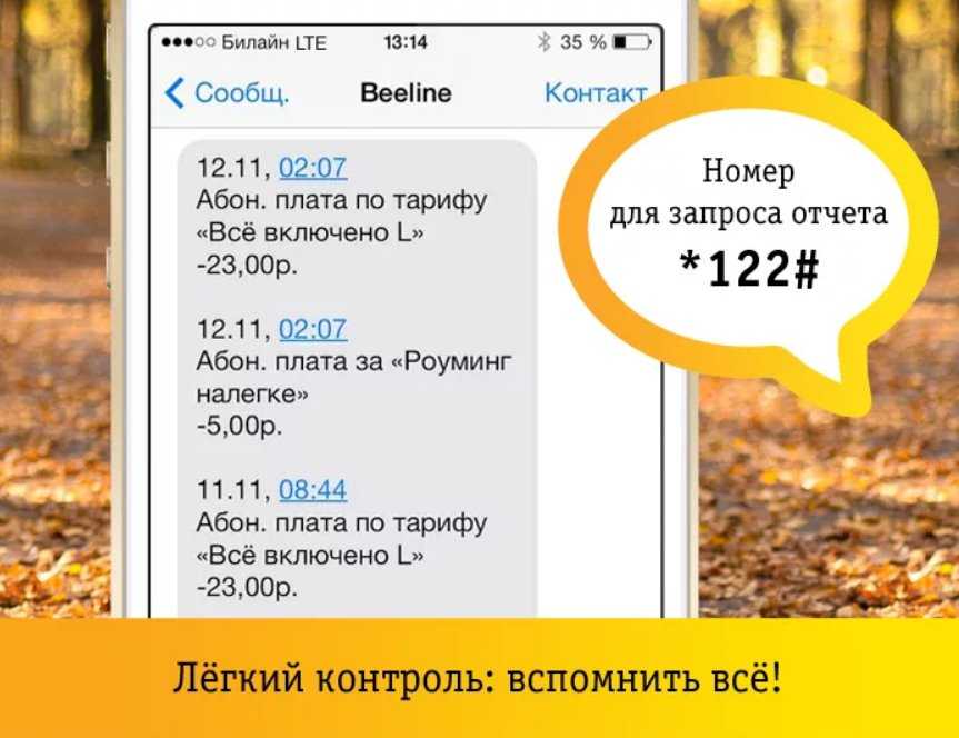 Если вы хотите узнать, на что были потрачены деньги и получить полный отчет по расходам на звонки, трафик, СМС и услуги, подключите опцию от оператора «Легкий контроль». Услуга покажет пять последних платных действий Билайн на экране вашего смартфона.