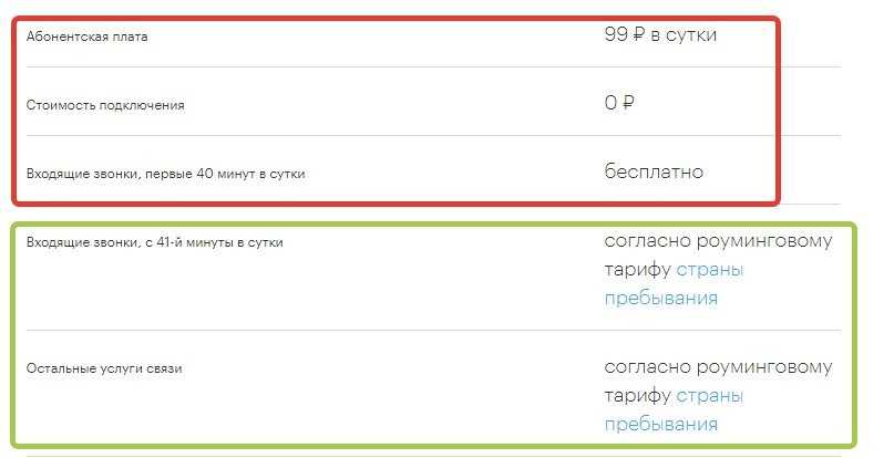 | Абхазия, Южная Осетия | 99 ₽ в сутки | 1 Гб. трафика + 60 минут исходящих в РФ или любых входящих (2 Гб. трафика в день в США, Пуэрто-Рико и на Виргинских островах) |
