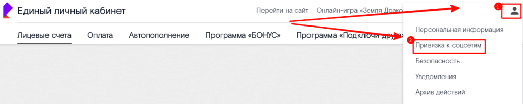 Чтобы пользоваться данной функцией, потребуется сперва подключить её в личном кабинете Ростелекома. В правом верхнем углу кликните по иконке, изображающей человека, и во всплывшем меню перейдите в раздел “Привязка к соцсетям”.