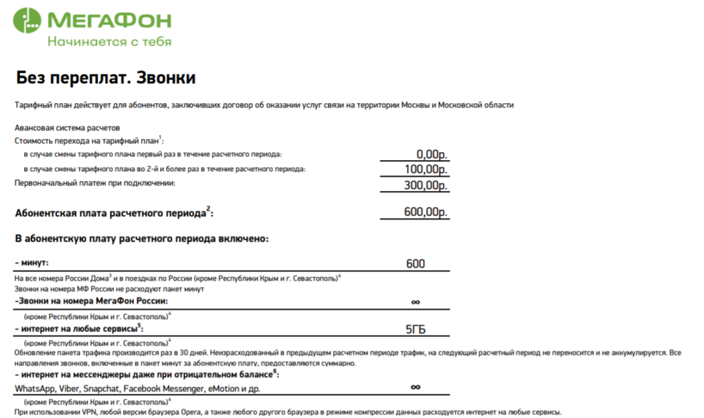 Для начала стоит поговорить об абонентской плате. На тарифном плане «Звонки» она составляет 600 руб. за месяц. За смену тарифа Мегафон не берет деньги, если в течение месяца вы не меняли тариф. Если переход осуществлялся, то снимут 100 рублей.