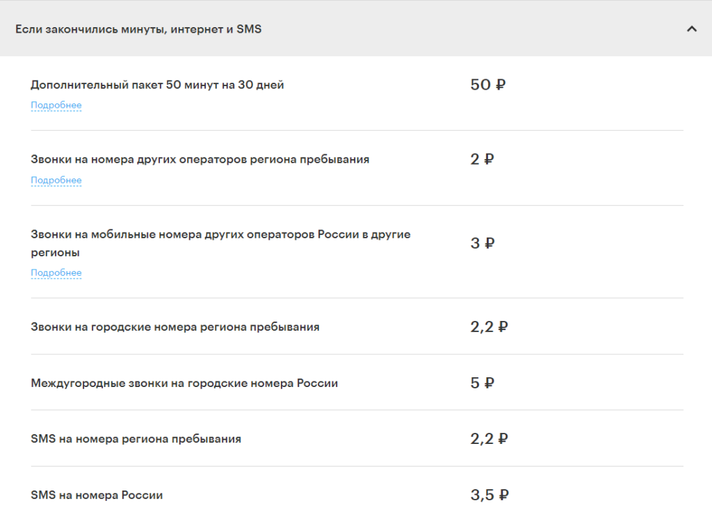 - Стоимость смс свыше пакета составляет 2,2 рубля в домашнем регионе и 3,5 — для остальных.