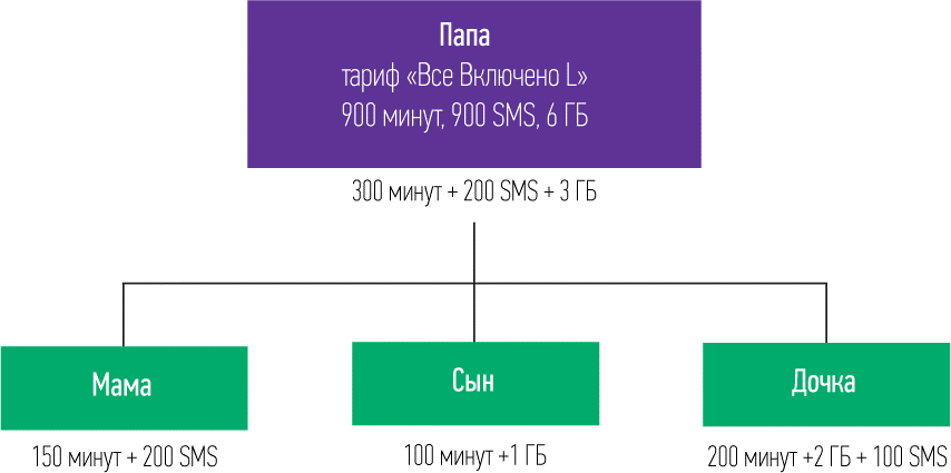 Все присоединённые пользователи, отправляют сообщения, пользуются интернетом и совершают звонки за счёт основного абонента. В случае полного израсходования лимитных пакетов, за предоставление дополнительных сотовых опций, абонентская плата будет списываться с основного абонента.