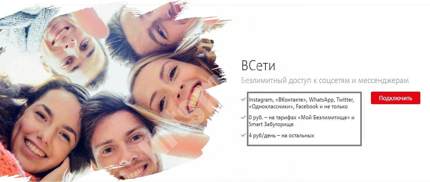 Функция «В сети» МТС позволяет общаться с друзьями, родными, коллегами и просто знакомыми в любой из указанных соцсетей. При этом учет расходованного трафика на указанные сервисы не распространяется. Как только пользователь переходит на сайт или в приложение из перечня, активируется режим безлимита, а главный пакет Интернета не используется.